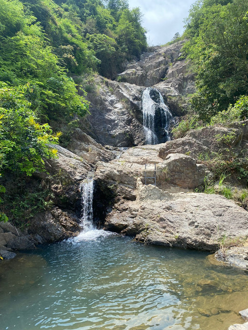 Once past the dam, its another 20 minutes of stream trekking before you will reach the first pool, and a mini man-made hut and seating area to the right, making for the perfect pitstop. If you continue on, you will eventually reach your first fork in the stream. We advise taking a left, until you hit another fork, at which point you should continue straight (i.e. the stream to the right). This will eventually come out to a few waterfalls, and although at an incline, it is passable for both humans and dogs, though will involve some scrabbling. Eventually you will reach the final falls (pictured below), which is identifiable by a makeshift step ladder a previous visitor has installed.
